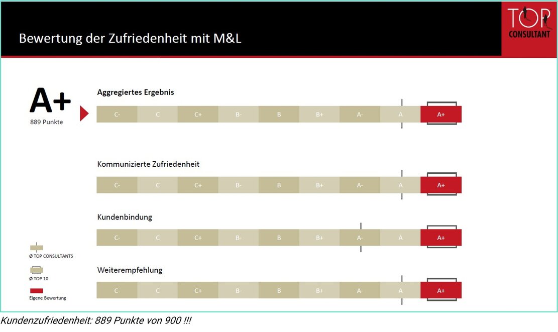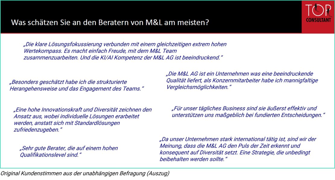 Die zuvor von der M&L AG benannten Referenzkunden gaben gegenüber der Wissenschaftlichen Gesellschaft für Management und Beratung (WGMB) an, wie zufrieden sie mit der Beratungsleistung der M&L AG waren und auch, ob sie das Beratungsunternehmen weiterempfehlen würden. Dieses Jahr hatten sich insgesamt 138 Beratungsunternehmen um das TOP CONSULTANT-Siegel beworben.