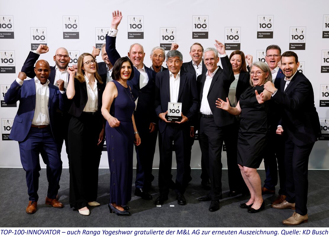 Da die M&L AG auch beim Innovationswettbewerb TOP 100 – zum 5ten Mal in Folge – die Auszeichnung zum TOP Innovator 2025 erhalten hat, gratulierte auch Wissenschaftsjournalist Ranga Yogeshwar als Mentor beim Deutschen Mittelstands-Summit in Mainz der M&L AG persönlich.