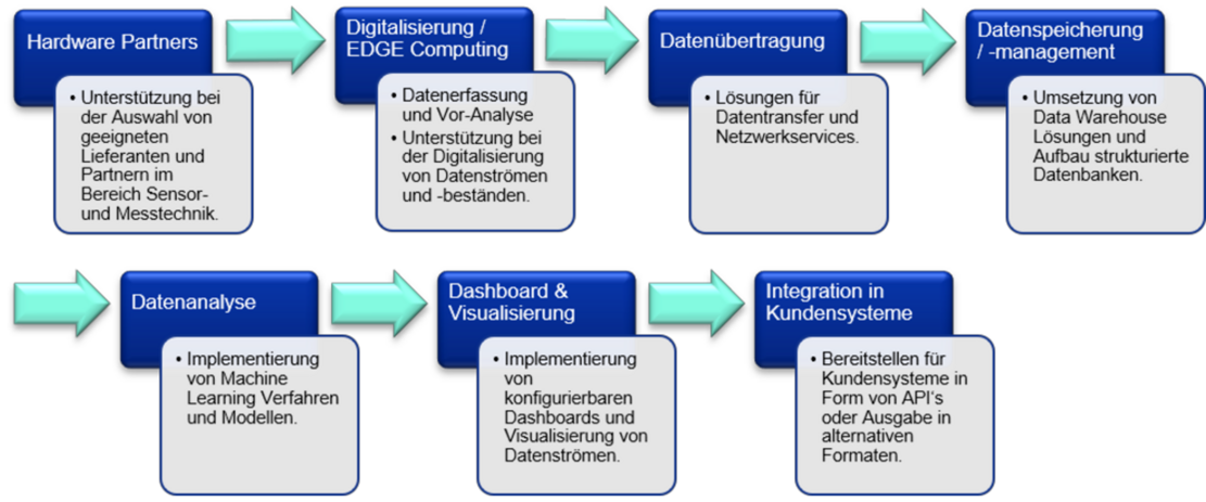 Als Full Service Dienstleister unterstützen wir Sie sowohl bei Vorhaben die sich ganzheitlich über die Wertschöpfungskette verteilen, als auch bei Projekten, welche nur einen Teilbereich der Wertschöpfung adressieren.