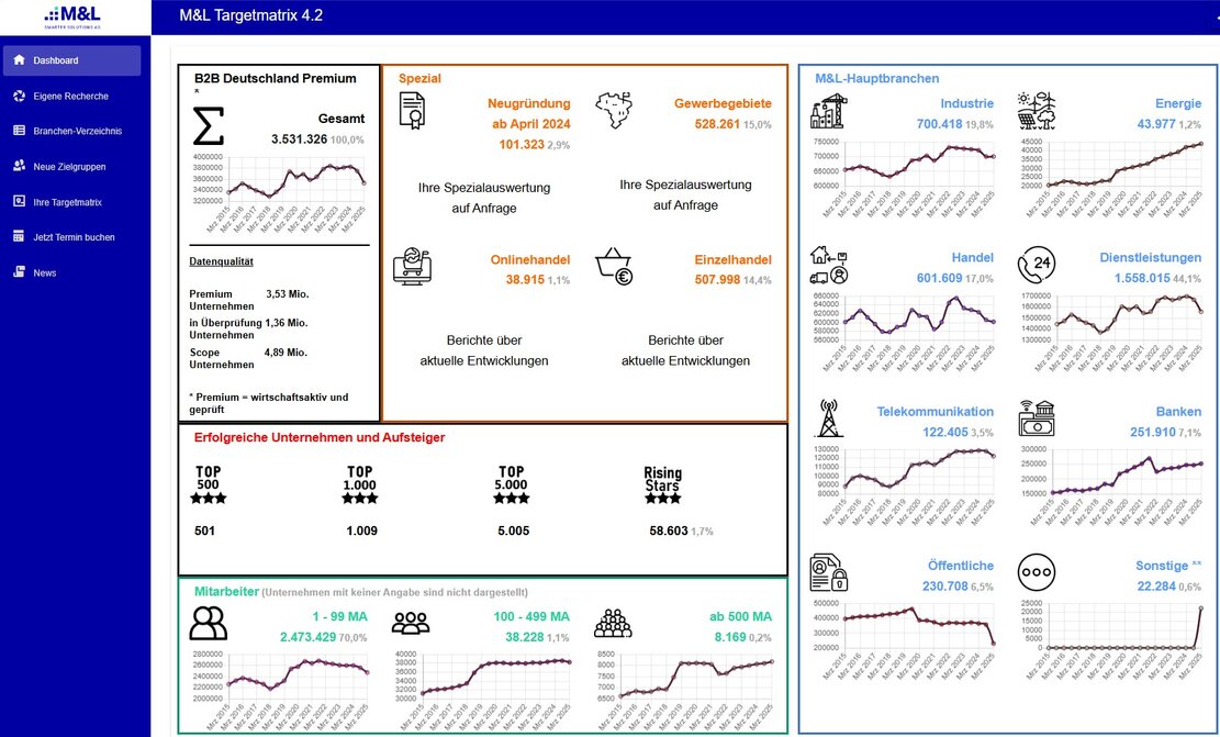 Mit der M&L Target Matrix steht Ihnen eine ständig aktualisierte Datenbasis mit rund 3,75 Mio. wirtschaftsaktiven Unternehmen in Deutschland zur Verfügung. Wir helfen und begleiten Sie dabei, daraus das für Sie relevante und adressierbare Potenzial zu selektieren und zu nutzen.