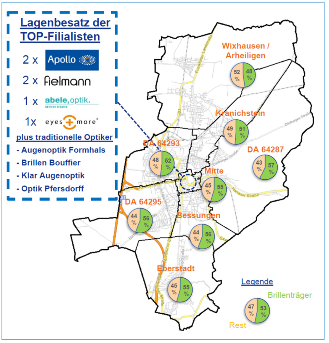 - Wäre Darmstadt Ihr Einzugsgebiet dann hätten Sie von über 155 Tsd. Einwohnern über 83 Tsd. Brillenträger als potenzielle Kunden (das sind 53% der Einwohner. Bei der Berechnung auf der Zielgruppe ab 16 Jahren steigt der Anteil sogar auf über 61%).